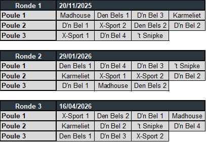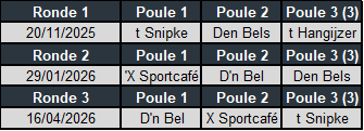 Let op: De poules wisselen iedere ronde van samenstelling, kijk dus goed in welke poule je zit.