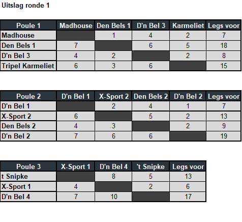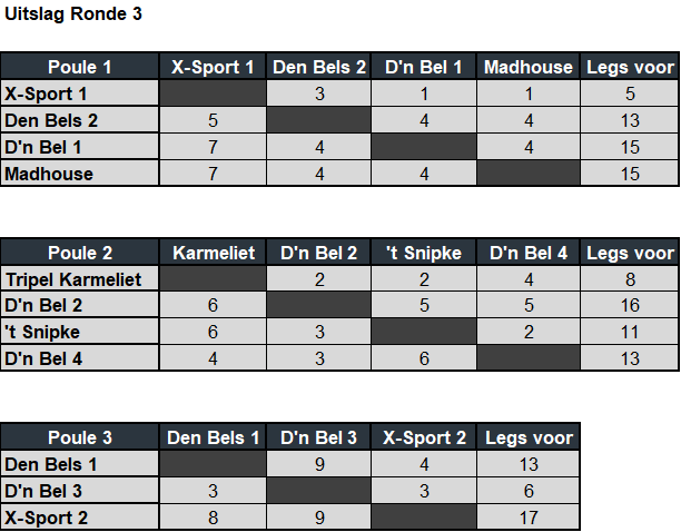 In de poule van 3 teams gooien we 2 wedstrijden van 12 legs.